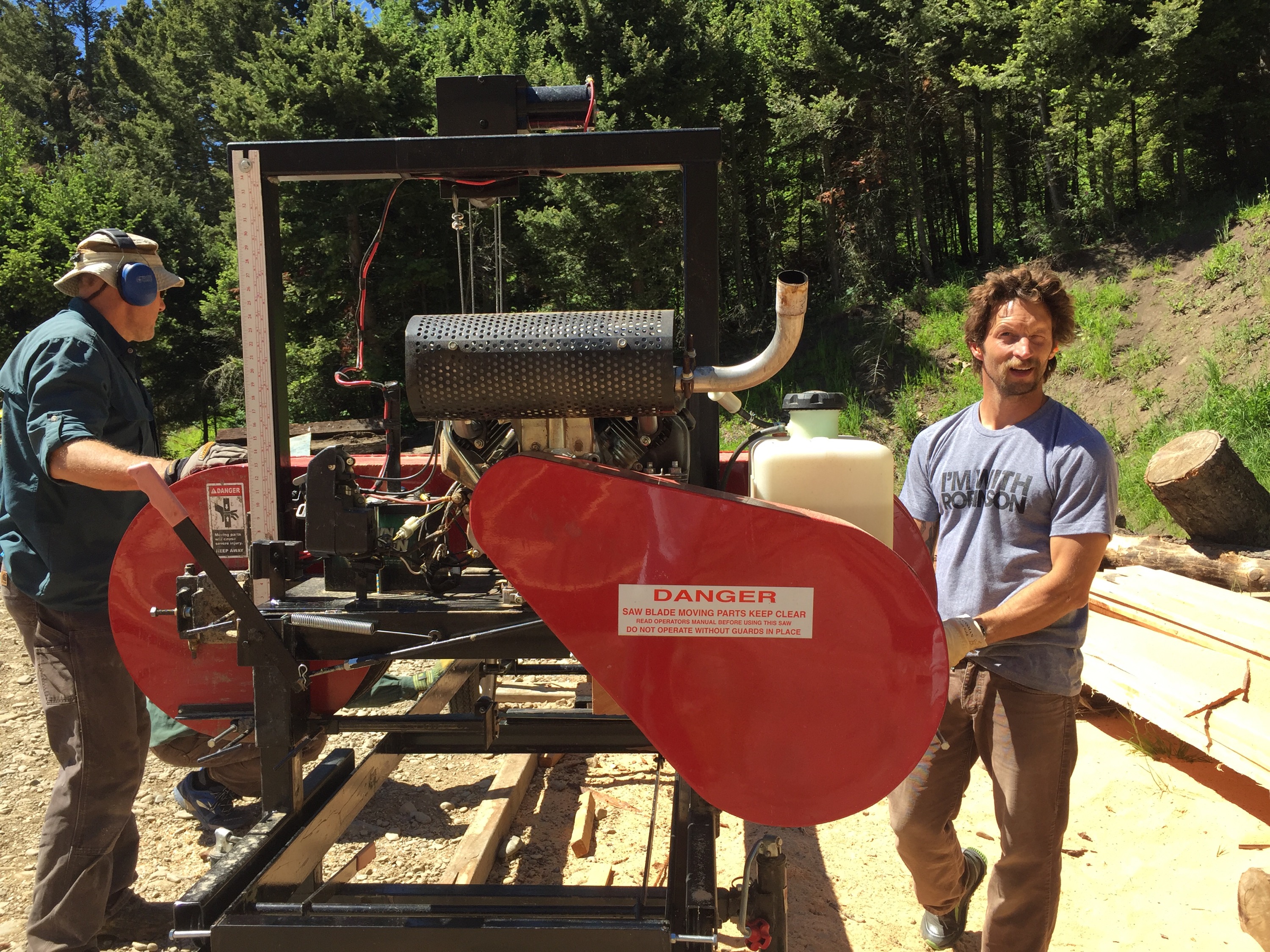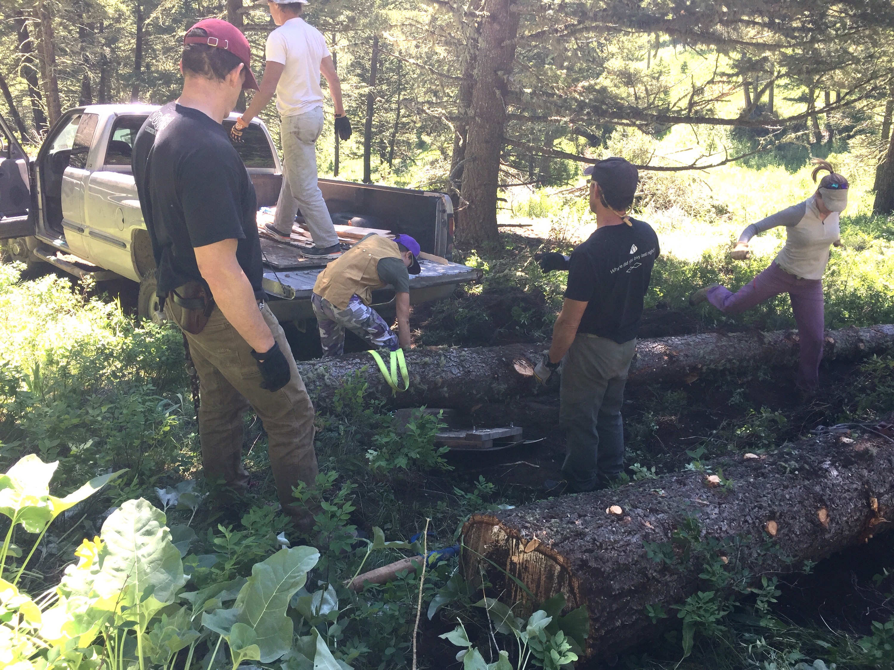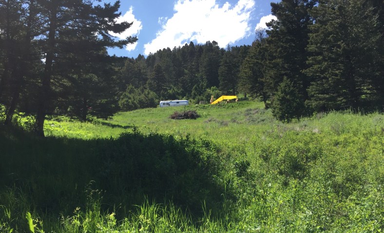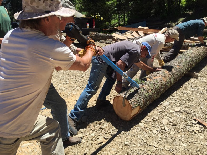 June 17-19th were spent camping on a 26 acre property. Along with about 30-40 awesome folks, we are contributing what we can to homestead our friend Chris’ beautiful place. Duties include clearing forest for a road, felling trees, sledding logs up to the mill, and assisting builders with a barn. Kai learned how to pull 1000 lb. logs behind a truck, move slag and make an orderly wood pile, and the entire process of outhouse duty! He can fill you in later. I carried wood and piled brush, did a little kitchen clean up, and took photos for the host. Des was a champ at sledding logs, setting up the mill and about 50 other things. It’s humbling to spend your energy on basic needs like water, food, and shelter. There is no plumbing or electricity so water is hauled up a hill from a container truck in 3 and 5 gallon jugs. We set up tarps and made tables from felled trees and stumps to create dining areas and tool “sheds.” Our van is performing well as sleeping quarters. Everyone needs to be self sufficient AND work! But a pro chef and a amazing guy cooked spectacular meals and even set out a Father’s Day brunch complete with French toast, elk sausage, and fresh berries with whipped cream. We met some incredible people and reconnected with a few old friends. Kai is having the time of his life. The rest of the week will be spent working at the homestead, exploring the town of Bozeman and getting to know super cool people!