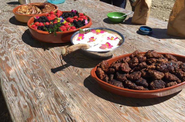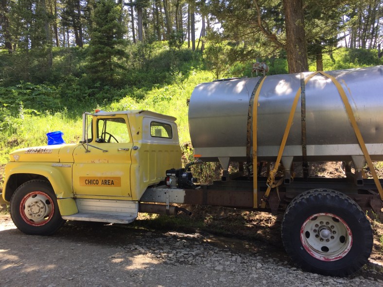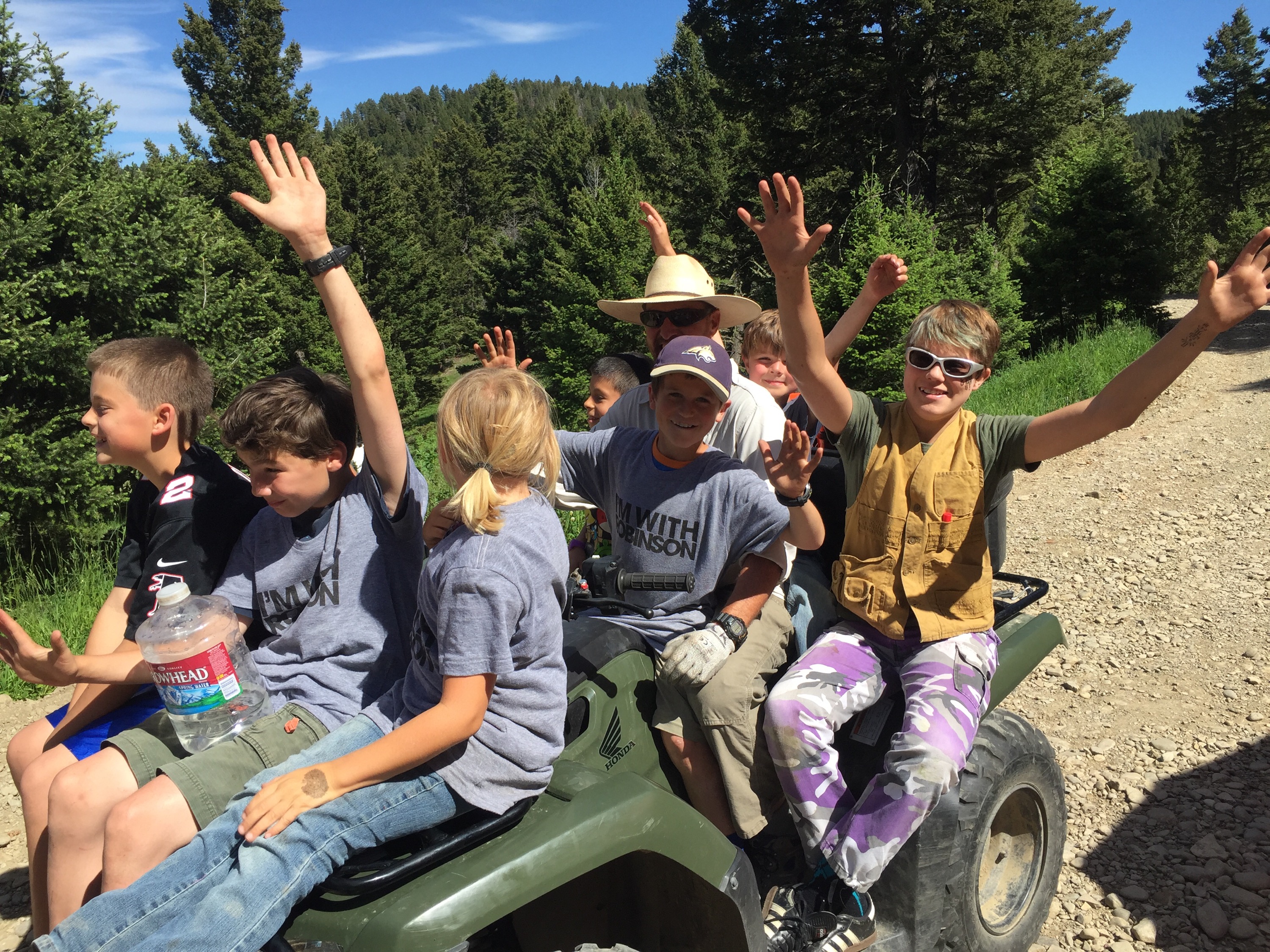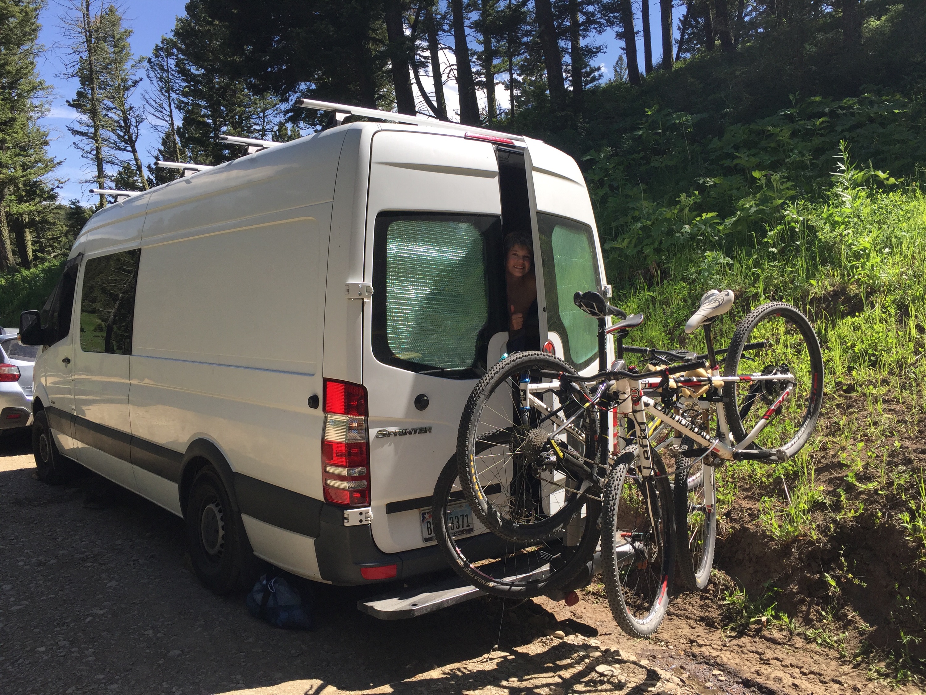 June 17-19th were spent camping on a 26 acre property. Along with about 30-40 awesome folks, we are contributing what we can to homestead our friend Chris’ beautiful place. Duties include clearing forest for a road, felling trees, sledding logs up to the mill, and assisting builders with a barn. Kai learned how to pull 1000 lb. logs behind a truck, move slag and make an orderly wood pile, and the entire process of outhouse duty! He can fill you in later. I carried wood and piled brush, did a little kitchen clean up, and took photos for the host. Des was a champ at sledding logs, setting up the mill and about 50 other things. It’s humbling to spend your energy on basic needs like water, food, and shelter. There is no plumbing or electricity so water is hauled up a hill from a container truck in 3 and 5 gallon jugs. We set up tarps and made tables from felled trees and stumps to create dining areas and tool “sheds.” Our van is performing well as sleeping quarters. Everyone needs to be self sufficient AND work! But a pro chef and a amazing guy cooked spectacular meals and even set out a Father’s Day brunch complete with French toast, elk sausage, and fresh berries with whipped cream. We met some incredible people and reconnected with a few old friends. Kai is having the time of his life. The rest of the week will be spent working at the homestead, exploring the town of Bozeman and getting to know super cool people!