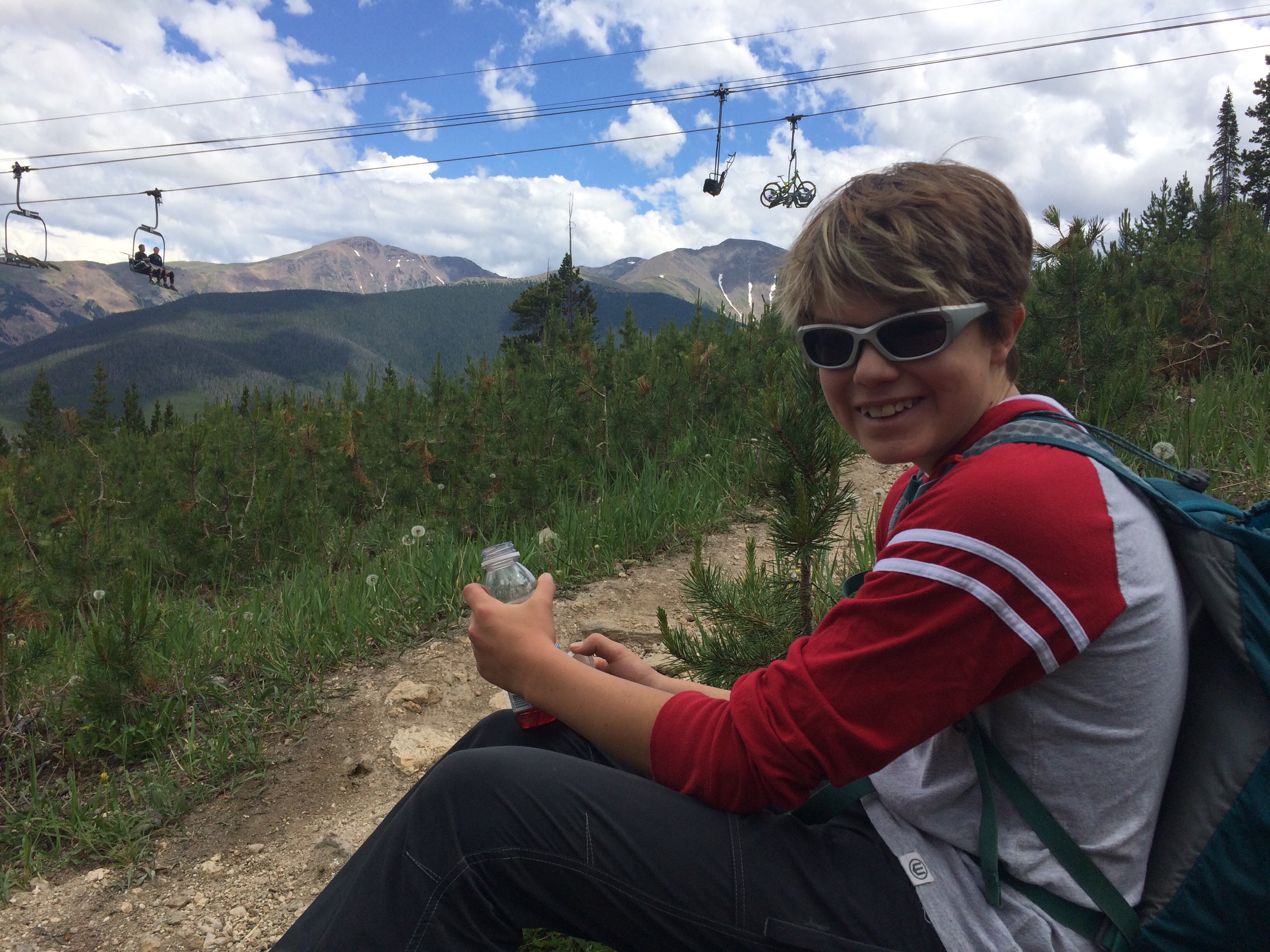 The Fraser River Valley has our favorite wide open space- the soccer fields! Lush, sticker free green grass for as far as you can throw an Aerobie! And at 9000 ft elevation it’s the perfect temperature. Yesterday Kai and I explored the mountains at a slower pace compared to Des’ downhill sprint. He biked nearly every trail taking many laps up the lift. Instead, we hiked up the Ute Trail to the top of the lift. Climbing 1600 feet in 2 miles is not easy. The reward was a berry smoothie at Sunspot cafe and their 2pm closing time was our motivation to keep up a steady pace. Early this week we took some short hikes, cross country biked, and played in the Winter Park resort. Today brought a big thunderstorm and cooler weather.