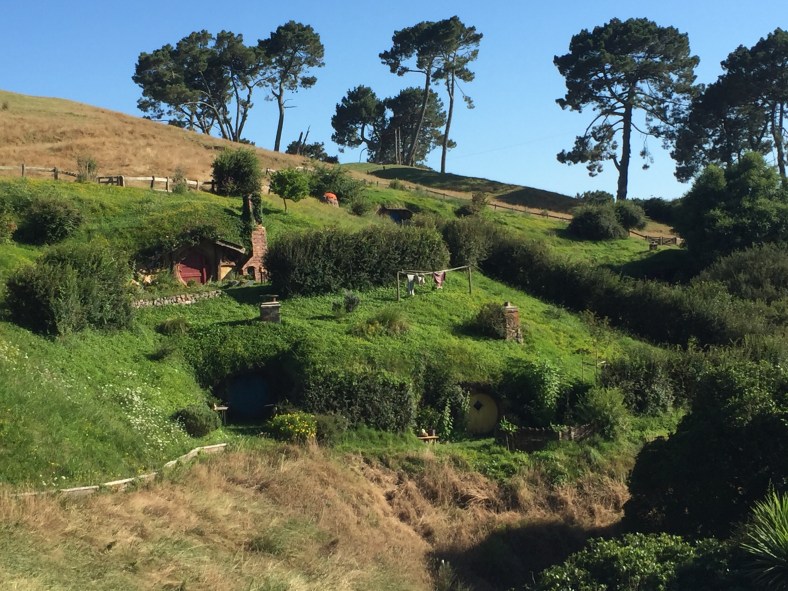Our tour guide let us in on movie making secrets, like how they filmed different sized actors in the same scene to make one appear dwarf size and how (and why) they built a huge fake tree leaf by leaf. A cook crafted a special 1% alcohol beer that had just the right amount of froth and just the right color so the actors and extras could drink throughout the town party 10 hour filming scene and stay sober enough to follow directions! She said the NA beer never looked authentic on camera. The entry to the Hobbit houses (holes) are shallow. All the interior scenes were filmed at a studio in Wellington. Kai was amazed at the detail of the structures and gardens, that 400-600 crew members were in the set every day, and the multiple location shoots. ” I guess I can see why their budget was $2 billion!” ( for all 3 hobbits).