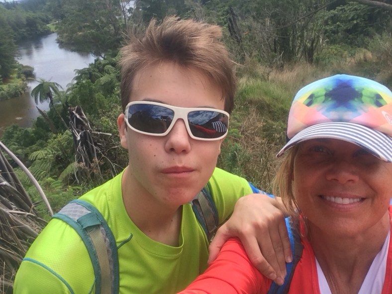 Below, Kai and I hiking and Des biking at Lake Mangamahoe, best place to mountain bike locally. We share one bike for now.