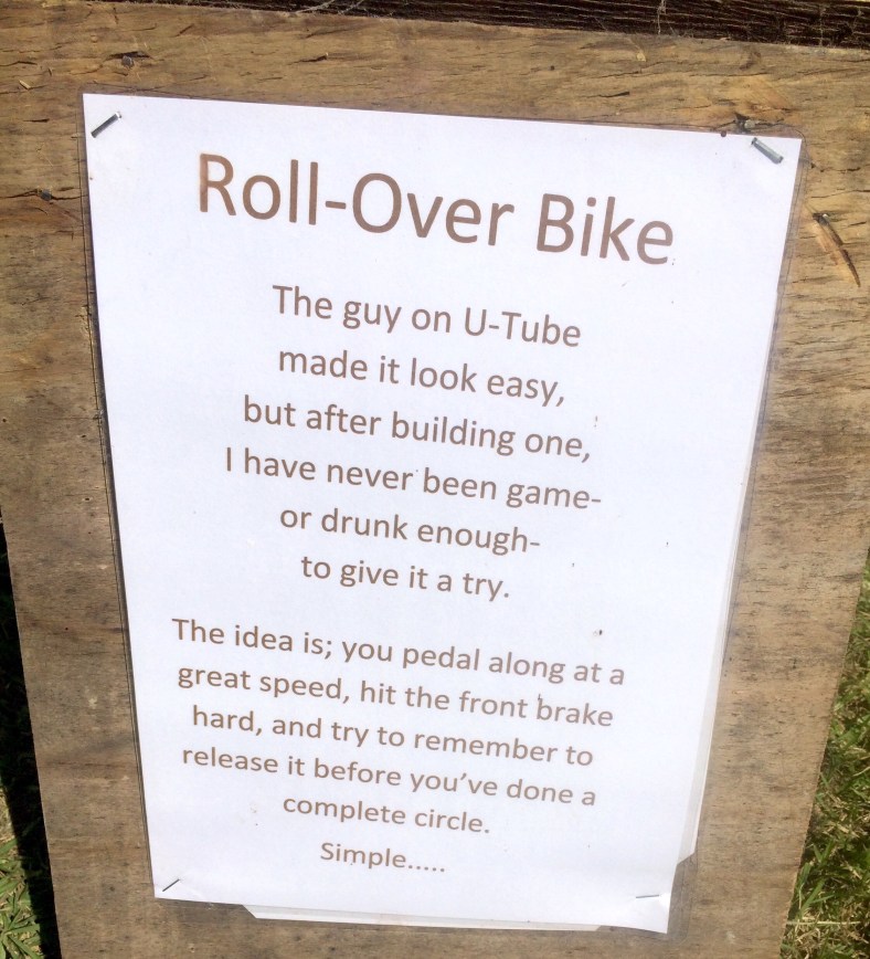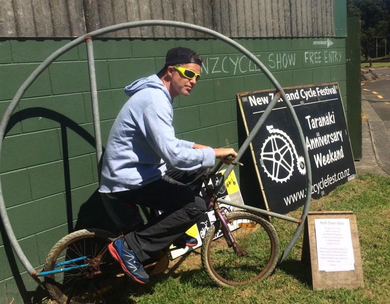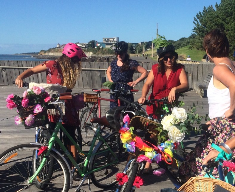 We took part in a few events at the Taranaki Cycle Festival this past weekend. I joined in the Frocks on Bikes mystery ride to support women riding bikes for daily transportation, wearing a frock or dress, for example. It was hilarious. 17 of us rode about town, paraded through an antique bike exhibit, and finished off with champagne at an art gallery. I had gone mountain biking before with one of the gals (red dress and ferns in her helmet). She led me and 2 others on a “beginner” ride. “Come on, it’s got some tricky parts but give it a go!” Kiwis definitely blow past the intro level in most outdoor activities.